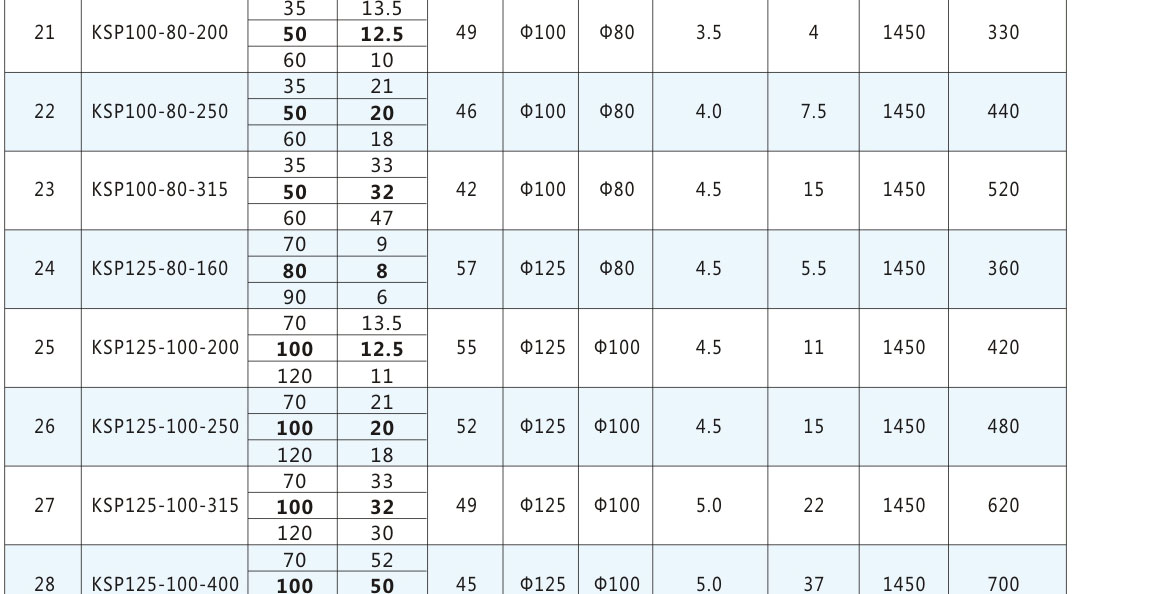 KSP:耐腐耐磨夾板泵代號丨80:進(jìn)口直徑80mm丨65:出口直徑65mm丨160:葉輪直徑125mm